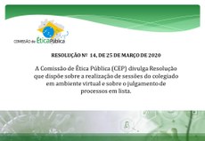 A Comissão de Ética Pública (CEP), no âmbito de sua missão institucional, e assumindo o compromisso de adotar medidas para o enfrentamento da situação emergencial de saúde pública de importância internacional decorrente do coronavírus (COVID-19), informa a aprovação da Resolução nº 14, de 25 de março de 2020, que dispõe sobre a realização de sessões da CEP em ambiente virtual e sobre o julgamento de processos em lista, publicada em Edição Extra do Diário Oficial da União desta quinta-feira, dia 26 de março de 2020.